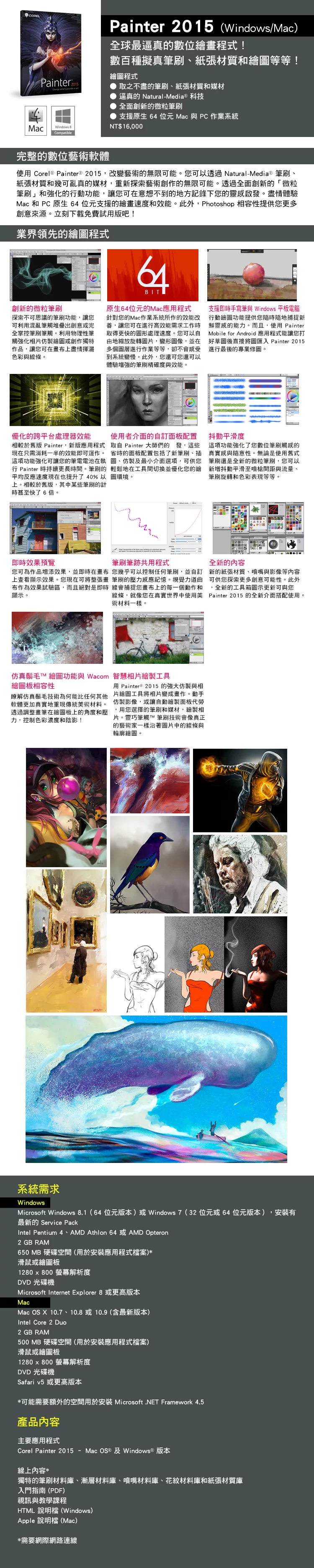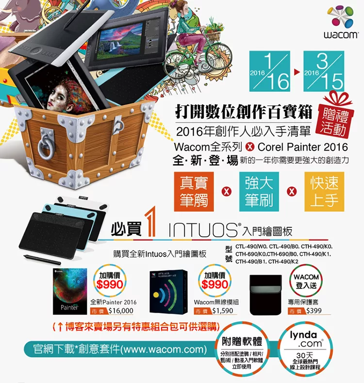 Intuos繪圖板與數位筆、USB傳輸線、替換筆尖、軟體下載簡介與密碼、快速啟動手冊、安裝光碟片、Painter2015(專案版)