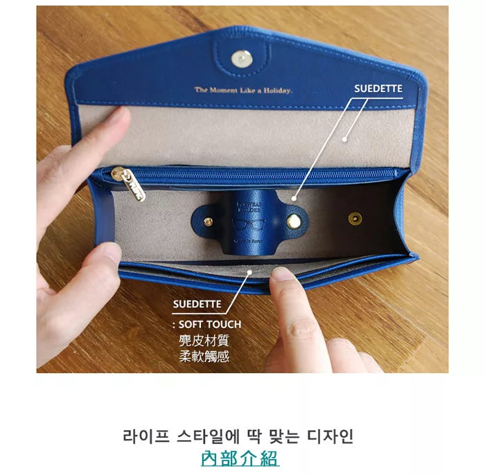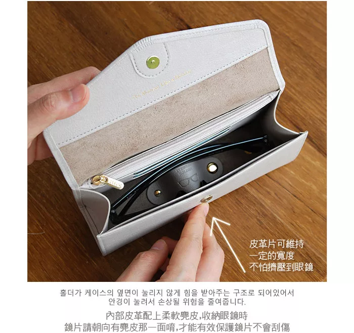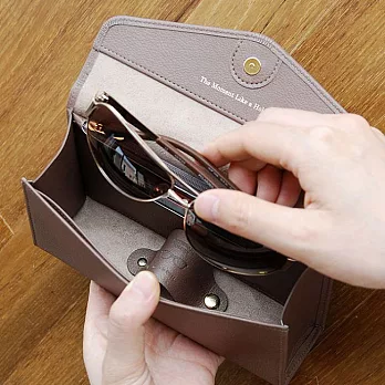 *眼鏡收納包內部底層有一片皮革,可搭配兩顆子母釦設計攤平或立起。