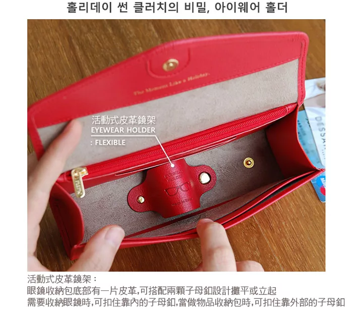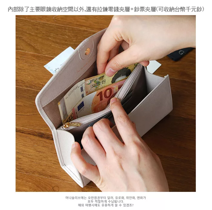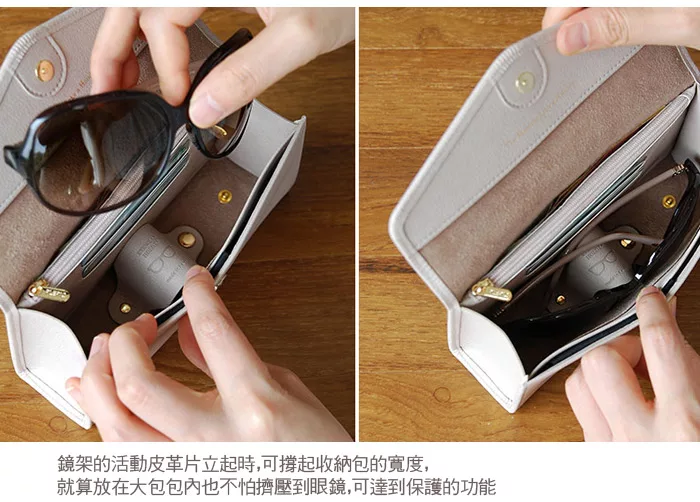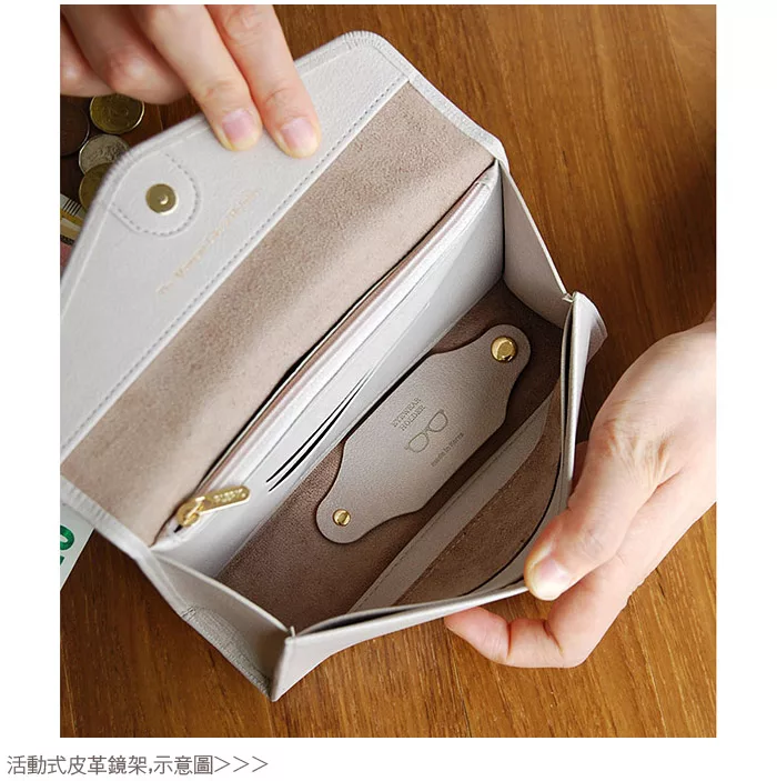 *需要收納眼鏡時,皮革片可扣住靠內的子母釦變成鏡架,收納物品時,可扣住靠外部的子母釦變成攤平狀態,即可收納物品。