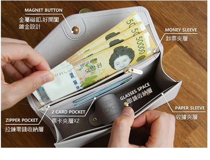 外出時可收納票卡、鈔票、零錢、鑰匙..等重要物品。