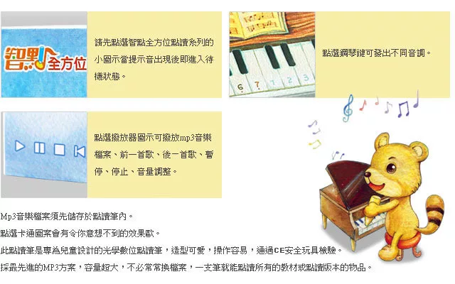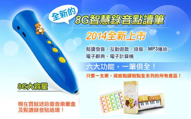 本產品容量超大(8G),一枝筆可以搭配多套教材,方便又省錢。本公司陸續推出豐富、多元的教材,不僅讓小朋友開心學習,連成人也能從中受益,請參考【智點】全系列出版品。