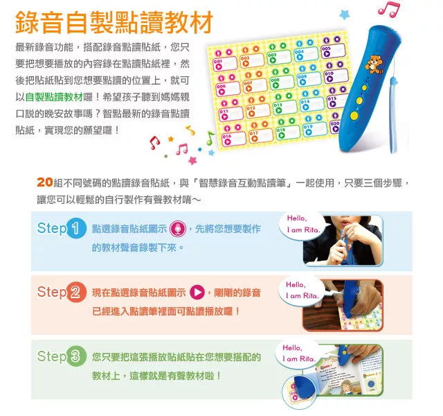 全新推出DIY錄音貼紙,讓您輕鬆自製點讀教材,將家中有聲讀物全部納入。